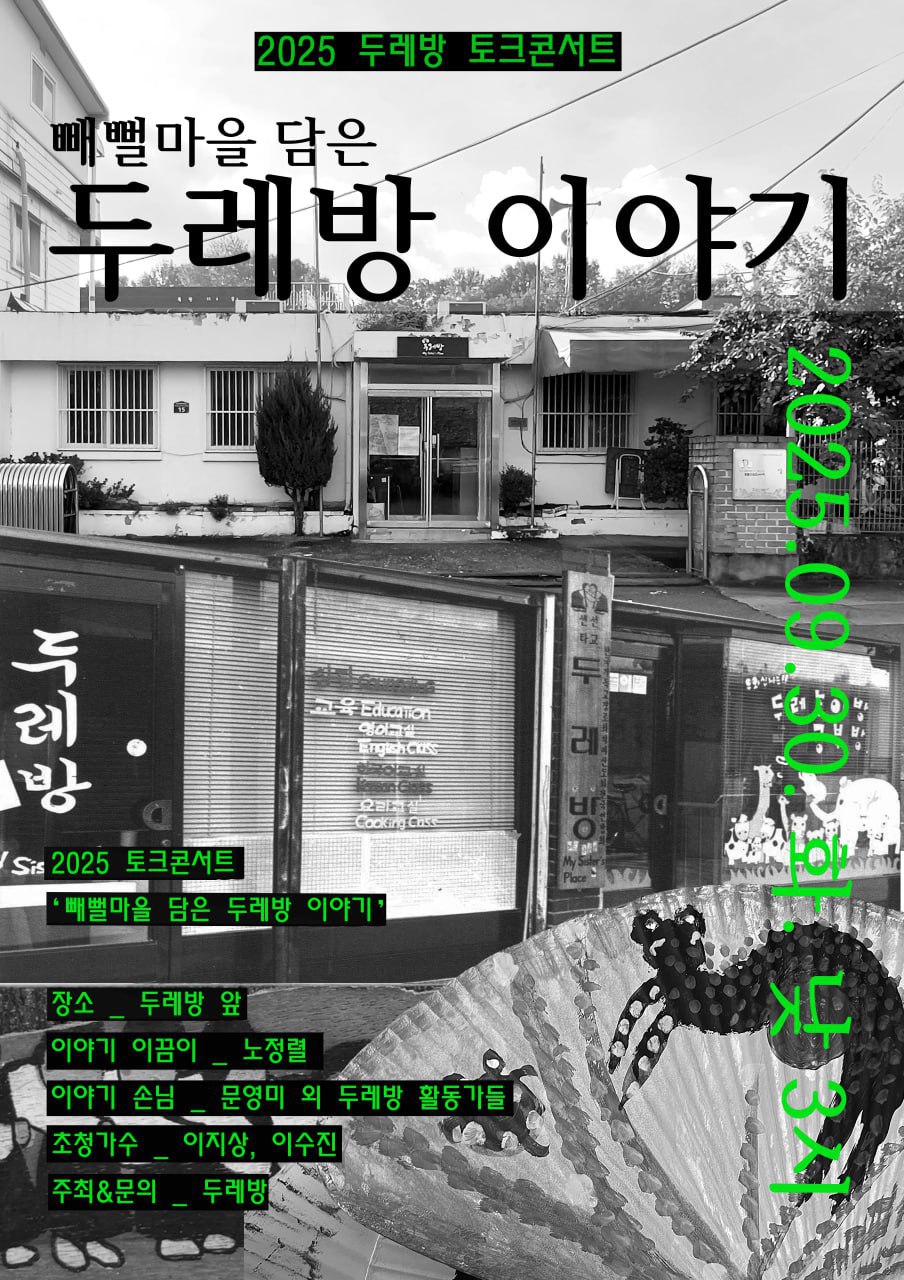 현재 두레방이 자리한 건물은 1970년대 기지촌 여성들이 일주일에 두 번씩 강제적으로 성병 검진을 받았던 성병검진소였습니다.국가가 기지촌 여성들의 몸을 외화벌이의 수단으로 관리, 통제한 아픈 역사의 현장인 이곳은, 두레방이 25년간 자리하며 '언니들의 사랑방'이자 회복과 치유의 현장으로 탈바꿈 되었습니다.하지만 2022년부터 계속된 의정부시의 상담소 이전 종용으로 인해, 결국 두레방은 빼뻘마을을 떠나기로 결정하였습니다.이번 토크콘서트는 두레방이 이사하는 전 날, 빼뻘마을 기지촌 뿐만 아니라 두레방 역사의 일부이자 터전이었던 "옛 성병진료소" 공간에서 열립니다.두레방은 어느 곳에서든 기지촌 여성들의 인권 지원 활동을 지속할 것이며, 오랫동안 동고동락했던 지금의 "옛 의정부 성병진료소" 건물도 '기지촌 여성들의 기억 저장소'로 끝까지 남아있어야 할 것입니다.기지촌 여성들의 증언과 '두레방 이야기'가 끊이지 않기를 바라는 마음으로 함께 이야기하며 노래하는 자리를 마련하였으니 많은 관심과 참석 부탁드립니다.